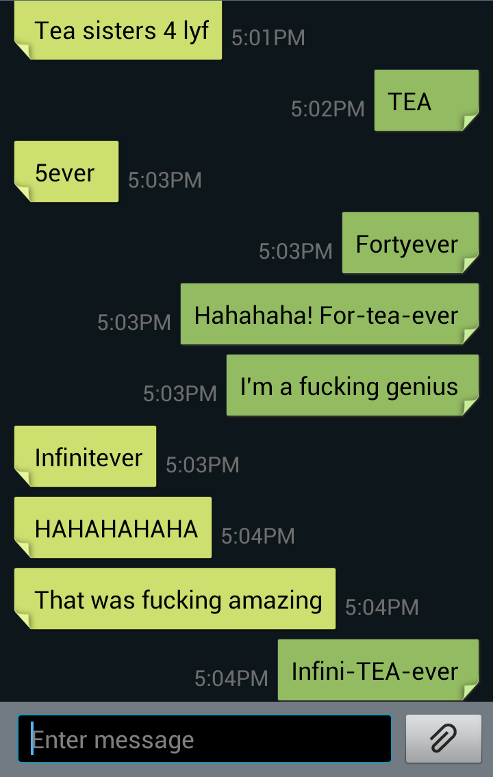 I live and love with the greatest guy I could ever ask for, who has been in my life for the best five years of my life. He won't give tea a chance, but I love him anyways. And I guess I can just take comfort in the fact that I won't ever come home and have to say "Where the fuck is my tea?!" But our little lovebird, Yoshi, certainly loves to share a cup with me.